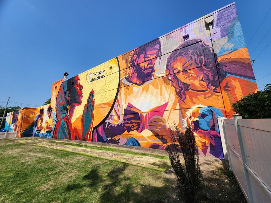 We are celebrating the families we serve by significantly improving the outdoor children’s play area at City Rescue Mission. We’ve installed a beautiful, building-sized mural overlooking this new space.